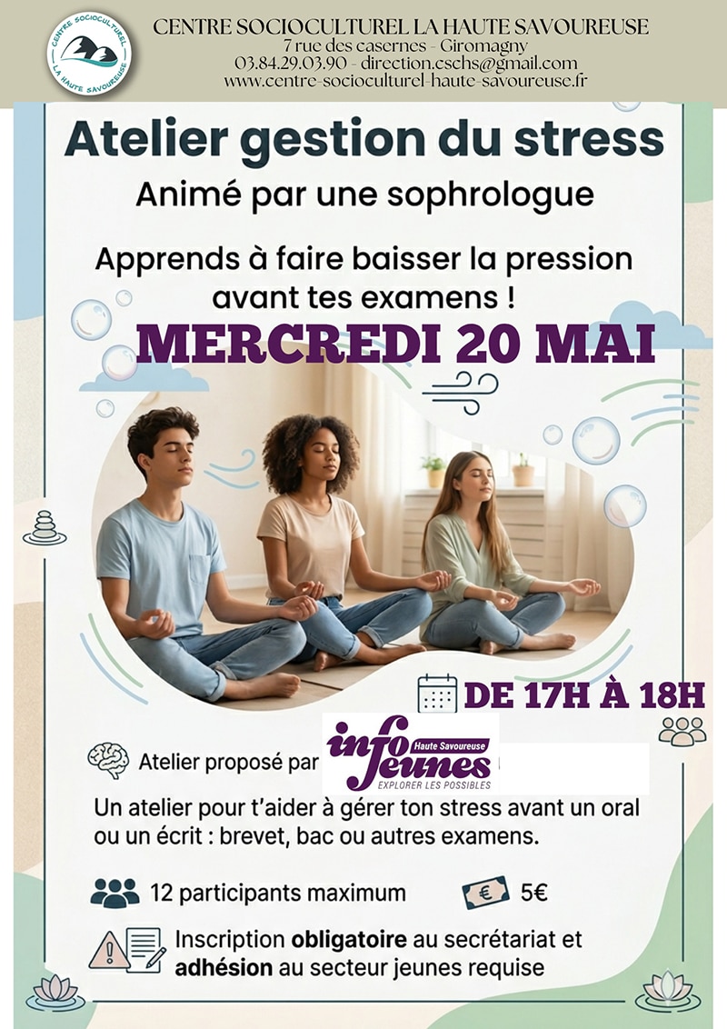 20 mai : Atelier gestion du stress – faire baisser la pression avant les examens de 17h à 18h